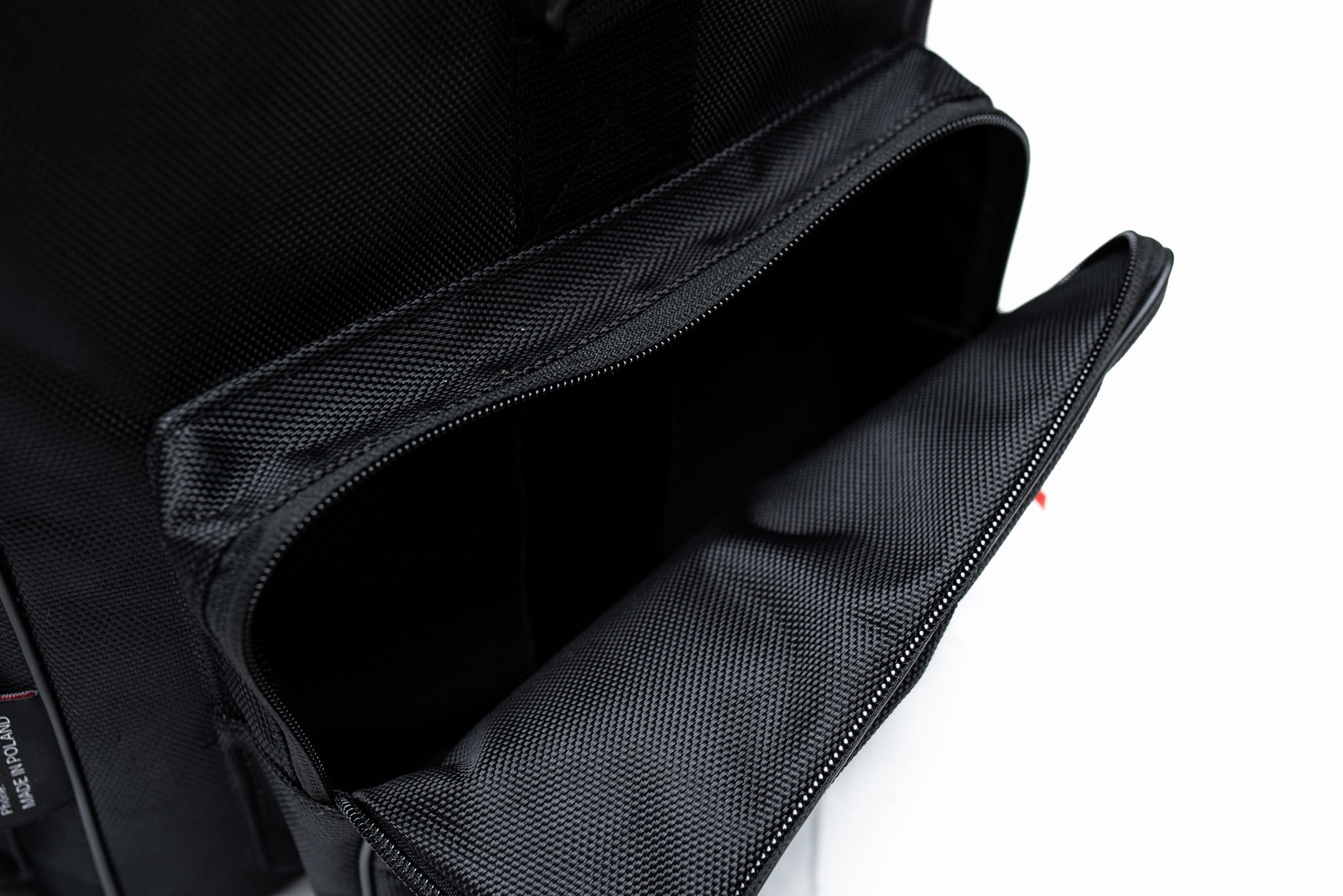Wnętrze komory na odtwarzacze wyściełane jest wytrzymałym a zarazem delikatnym materiałem, pod którym kryje się 1 cm pianki. Wszystkie ściany torby są dodatkowo usztywnione bardzo wytrzymałą płytą PEHD.