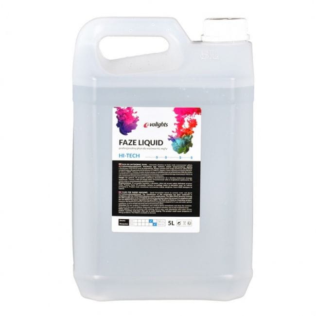 EVOLIGHTS FAZE LIQUID – profesjonalny płyn do wytwornic dymu (płyn do wytwornic mgły) powstały na bazie oczyszczonej wody i glikolu, przeznaczony do tworzenia scenicznych efektów specjalnych. Roztwór jest bezzapachowy, bezbarwny i nietoksyczny, a co za tym idzie bezpieczny w użyciu. Charakteryzuje się dużą wydajnością i doskonałym efektem lekkiego zamglenia. Emitowana para jest przejrzysta i stosunkowo długo się utrzymuje, subtelnie uwidaczniając promienie świateł reflektorów scenicznych. Lekki płyn do wytwornic dymu doskonale sprawdza się jako materiał eksploatacyjny dla różnego typu dymiarek i fazerów. Może być używany w technice estradowej, podczas kameralnych koncertów klubowych, w dyskotekach i pubach, a także na salach weselnych i różnego typu eventach.